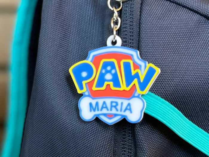 Llavero infantil inspirado en Paw Patrol con tu nombre grabado. Resistente, colorido y perfecto para fans de la patrulla canina.